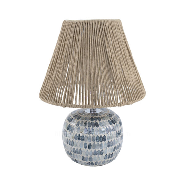 This mother-of-pearl table lamp features a round shape base and is adorned with a natural straw lampshade. This Mother of Pearl material adds a touch of elegance and natural beauty to the overall design.