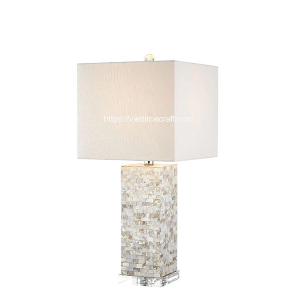 This mother-of-pearl table lamp features a square shape and is adorned with Mother of Pearl, which is a smooth, iridescent substance found on the inner layer of certain shells. The lamp is likely to have a base, a lampshade, and a light source. The Mother of Pearl material adds a touch of elegance and natural beauty to the overall design.
