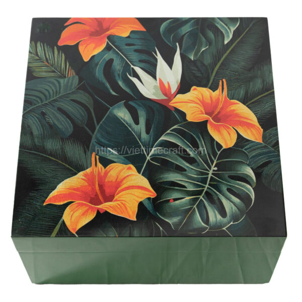 The tropical forest pattern adorning the box showcases the beauty of nature, featuring elements such as lush leaves, exotic flowers.